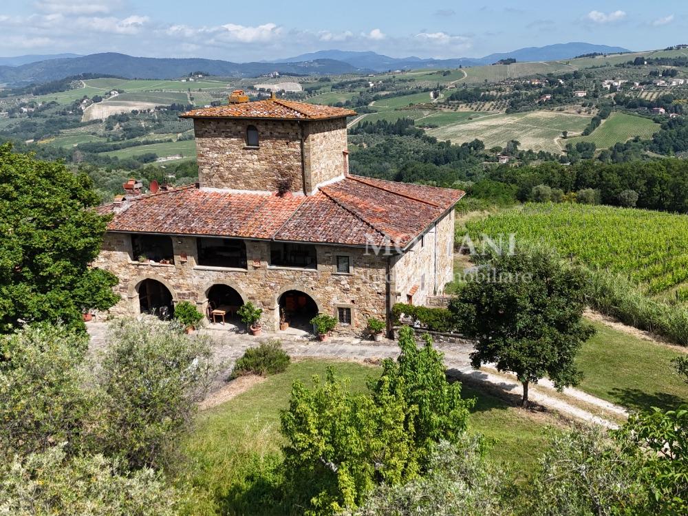 PERACCIO" FARM, PELAGO, FLORENCE. The farm is located in the hills of the Florentine Chianti region, in a panoramic position overlooking the picturesque village of Pelago, just 25 minutes from the historic center of Florence. It offers the opportunity to enjoy the beautiful Tuscan countryside, a farmhouse with a swimming pool and an excellent traditional restaurant, and easy access to Tuscany's most beautiful art cities. Castel Sofia is an 18th-century complex on medieval foundations of approximately 600 square meters, with 5 farmhouse apartments, currently used for hospitality, surrounded by a garden with a swimming pool. Adjacent to Castel Sofia is a contemporary building housing the reception, the farm shop, the restaurant with an open kitchen and a characteristic outdoor courtyard, the cellar, storage rooms, the whole of approximately 400 square meters in size, and two warehouses approximately 290 square meters in size. The property includes the farmhouse called "Le Puglie." Former monastery of the Vallombrosan Benedictine Friars dated 1769/1771 on their coat of arms on the facade. The building is spread over two floors, plus two floors of the medieval tower above, for a total of approximately 1,000 square meters. Ground floor: boiler room, laundry room, two levels of cellars, a beautiful loggia overlooking the farmyard, storage rooms, and two bathrooms. First floor: the owner's residence on three levels, comprising a loggia overlooking the valley with a wood-burning oven, a characteristic eat-in kitchen, two large living rooms with exposed beams and a fireplace, three bedrooms, and two bathrooms.Another section of the master apartment, currently unused, comprises a large living room, two additional bedrooms, and two additional bathrooms. The architecture of this ancient farmhouse, with its two rows of arches on the façade, central tower, and exposed stonework, makes it a rare example of a typical Tuscan farmhouse, a highly prestigious property brimming with charm.The wine and oil production is completely organic. The property extends over approximately 20 hectares, partly planted with vineyards, producing approximately 10,000 bottles per year; partly planted with olive groves of 3,100–3,200 olive trees; partly cultivated with specialized olive groves; and partly cultivated using the ancient cultivation system of centuries-old olive trees, irregularly distributed across the land. The average annual production is approximately 5,000 quintals, equivalent to 5,000 liters of organic extra virgin olive oil. Over the years, the oil has consistently received recognition and accolades for its excellent quality. The remaining land is woodland.
